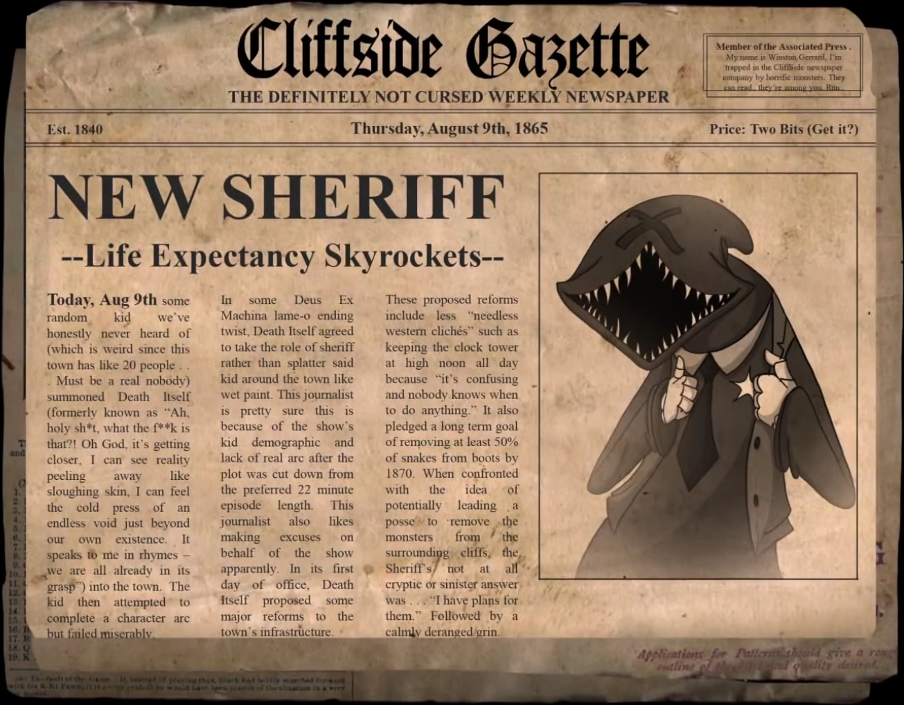 The Cliffside Gazette is CliffSide's local newspaper company which was established in 1840 and its newspapers costing only 2 bits (25¢) a piece.